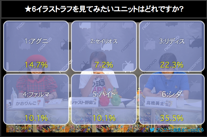| 今回は投票で最も多かったユニットのみ、公開されるということで1番人気はマッドサイエンティストのシダさんでした。私としてはリディスが見たかっただけに残念。 |